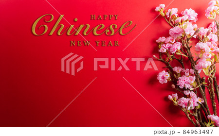 Chinese new year decorations made from plum blossom on a red background. A symbol for fortune, good luck, wealth, money flow.