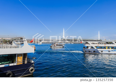 トルコイスタンブールの金角湾メトロ橋と観光船