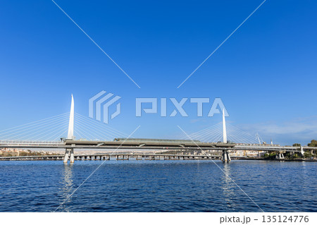 Panoramic view of Golden Horn Halic Metro Bridge in Istanbul, Turkey. It is a cable stayed bridge carrying the M2 line of the Istanbul Metro across the Golden Horn