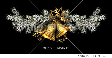 Merry Christmas. Isolated composition of a golden bell and fir tree branches.