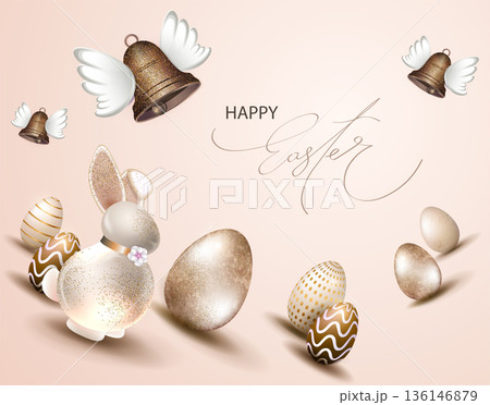 Happy Easter. Festive card with a porcelain bunny, golden eggs, and bells