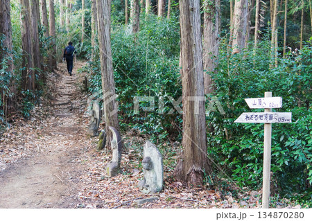 埼玉県:石仏が並ぶ御嶽山のハイキングコースと標識/神川町