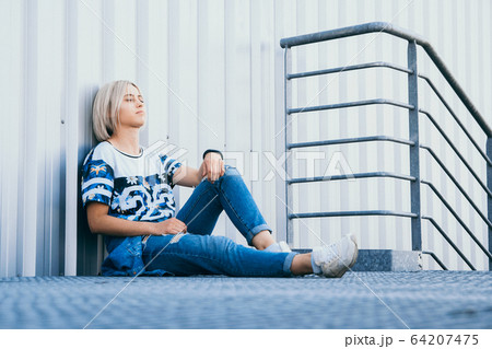 Beautiful girl with short white hair dressed in jeans in urban style sits on the background of a white wall. Place for text