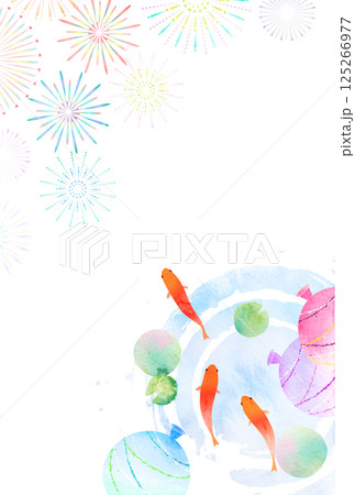 涼しい夏祭りのヨーヨー水風船と金魚の手描き水彩暑中お見舞いイメージ