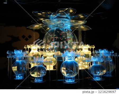 【ウクライナ】首都キーウの旧市街ポジールのショーウィンドウに飾られたカラフルな大きい金魚のオブジェ