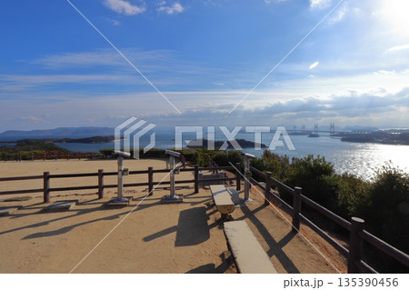 岡山県倉敷市の鷲羽山の鍾秀峰(山頂展望台)から南東側の眺望(ビジターセンター,松島,香川県など)