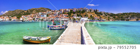 Traditional colorful Greece - travel in beautiful Samos Island, scenic Pythagoion town. view with traditional boats