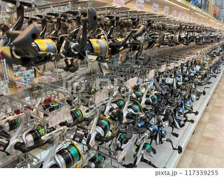 リールが並ぶ釣具屋の店内
