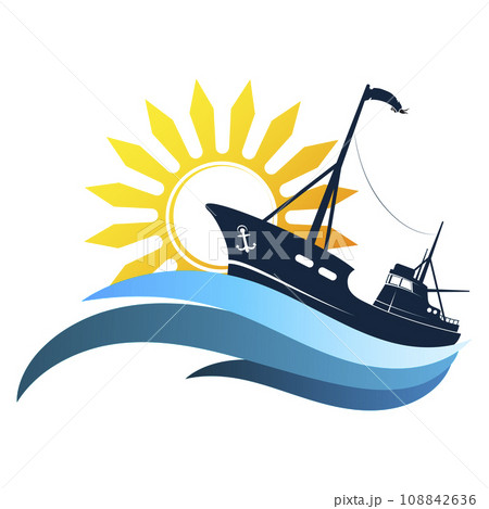 Fishing trawler on blue wave and sun. Design for industrial fishing