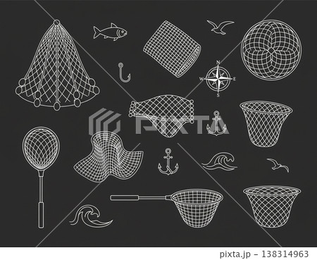 Fishing Net and Marine Equipment Wireframe Illustration Set