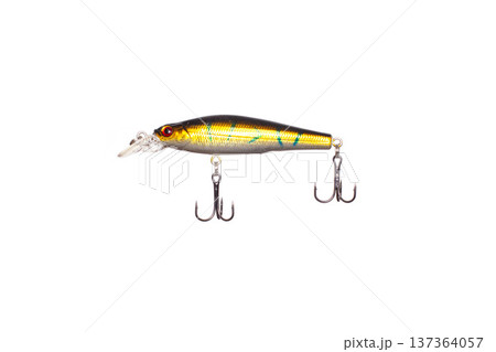 Fishing wobbler bait for predator fish isolated on white background. Artificial lure with sharp treble hooks for angling sport activity.