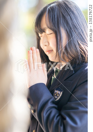 神社で静かに目を閉じ手を合わせ祈る制服姿の女子高生