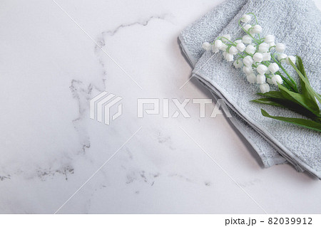 鈴蘭・すずらん・スズランの花。コピースペース有りの白背景・白いタイル。