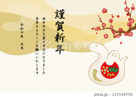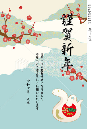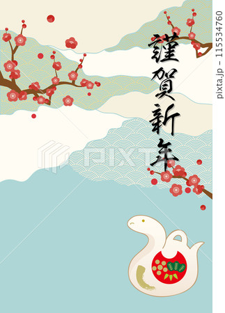 巳年の年賀状素材 和柄の背景 梅の花 蛇の置物
