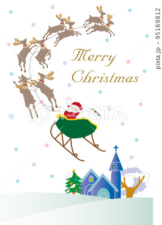 トナカイのそりで飛ぶサンタクロースと教会のクリスマスカード