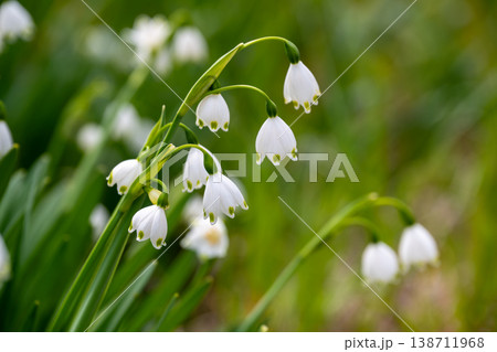 雨上がりの春の光に水滴が輝く可憐なスノーフレーク(鈴蘭水仙)の花