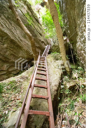乳岩峡(愛知県新城市) 登山道の急斜面に設置された鉄のハシゴ(階段)