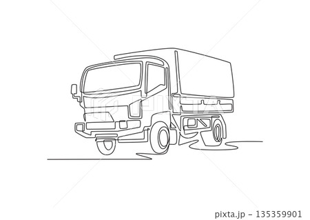 Continuous one line drawing standard military logistic truck. Covered cargo bed, tall cabin, robust chassis for transporting supplies and equipment. Single line draw design vector graphic illustration