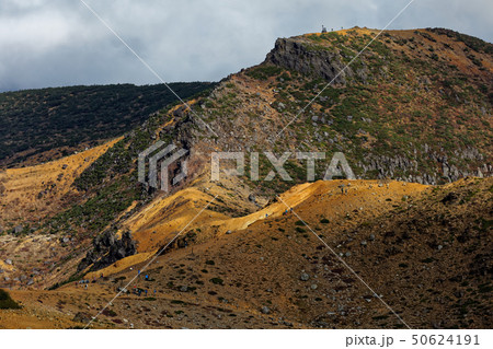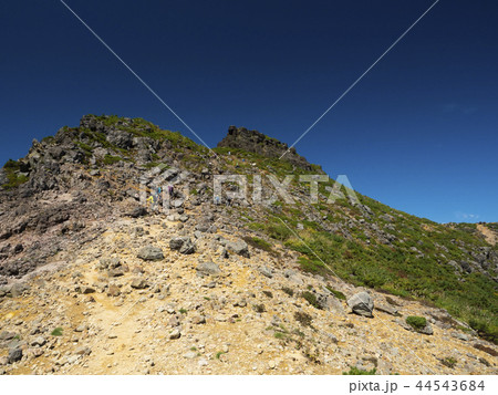 安達太良山・鉄山から見る沼ノ平の火口壁と登山者