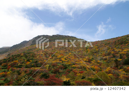 紅葉の安達太良山中腹から望む鉄山と箕輪山