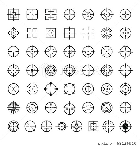 Various weapon sights, sniper rifle optical scopes. Hunting gun viewfinder with crosshair. Aim, shooting mark symbol. Military target sign, silhouette. Game interface UI element. Vector illustration