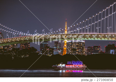 東京の観光地で夜のレインボーブリッジと都市の風景