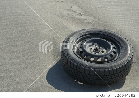 砂浜に置かれたタイヤ