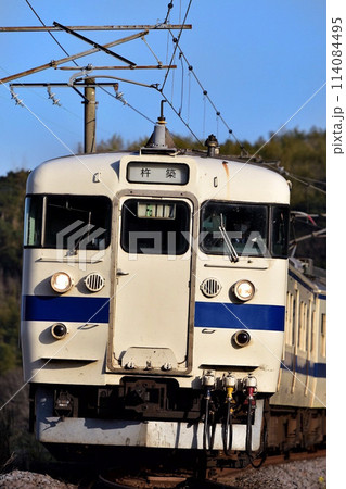 満開の桜と信濃川に見守られながら駆け抜けるしなの鉄道115系電車(横須賀色)_2025/4/19撮影
