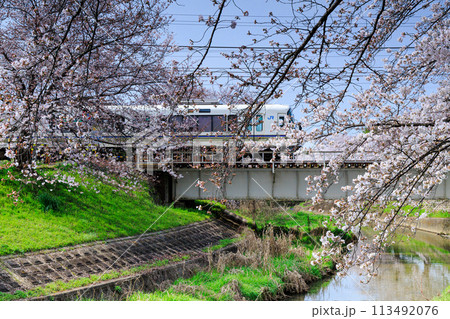 2024春佐保川の桜 薄紅色の花に囲まれた佐保川橋梁を通過するJR大和路線の快速電車③