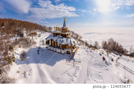 Aerial top view to wooden church of Transfiguration covered snow of the Lord on mountain near village Port Baikal. Frozen ice Lake and river Angara on backgroud. Winter landscape Siberia, Russia.