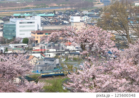 一目千本桜 満開のソメイヨシノが咲き誇る白石川堤を花見客を乗せて電車が走る