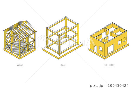 建築構造の図解イラスト、木造・鉄骨・鉄筋コンクリート・鉄骨鉄筋コンクリートのアイソメトリックイラスト