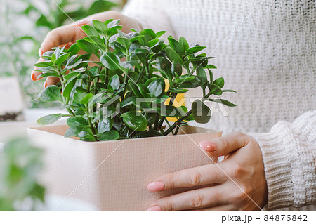 Woman holds pot with home plant in her hands. Eco-friendly lifestyle. Home gardening concept. Growing potted flowers.
