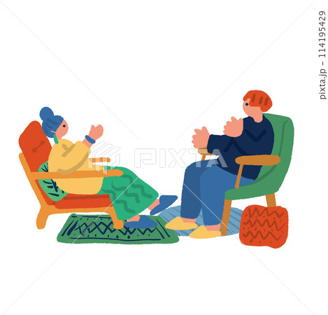 リビングのソファーに座って会話をする男女の手描きイラスト