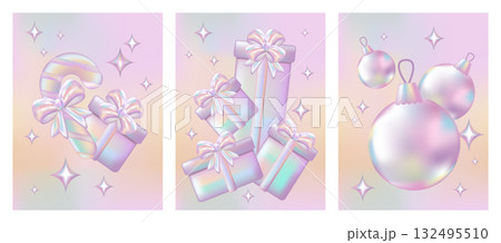 3d holographic Merry Christmas Poster or banner set with Pink Chrome Candy Cane, Gift box, Baubles in Y2K style. Christmas element for Retail, Shopping or Christmas Promotion. 3D chrome bubble art