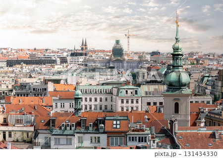 Green copper dome is rising above the red roofs of Prague in a sunny summer day