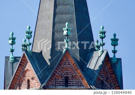 Historic Gothic Revival Church Spire with Verdigris Copper Finials and Brick Gables.