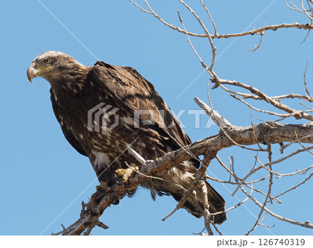 鋭い眼をして枝に止まるハクトウワシの若鳥