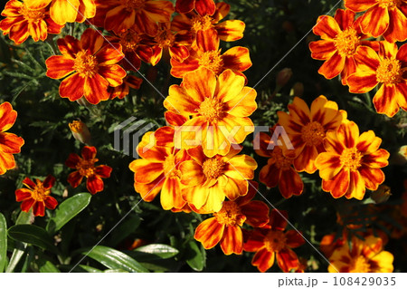 秋の花壇に咲くマリーゴールドのオレンジ色の花