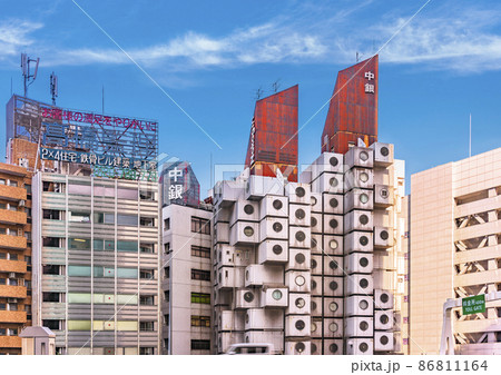 [東京・新橋] 黒川紀章の錆びれた中銀カプセルタワービルのファサード。