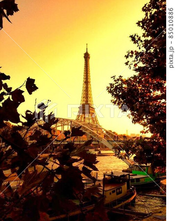 セーヌ川の畔から臨む夕暮れのエッフェル塔