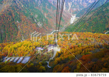 新穂高ロープウェイのしらかば平駅と紅葉した北アルプス