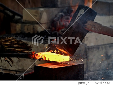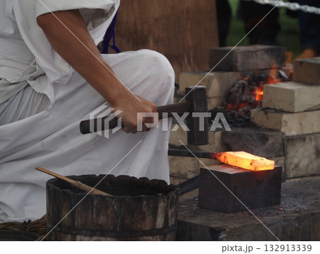 赤熱した鉄に粘土汁をかける鍛冶職人