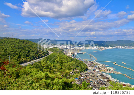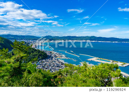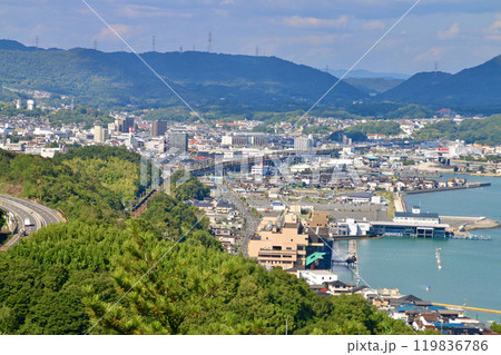 岡山県倉敷市の鷲羽山の鍾秀峰(山頂展望台)から北側の眺望(大畠,漁港,競艇場,福南山など)
