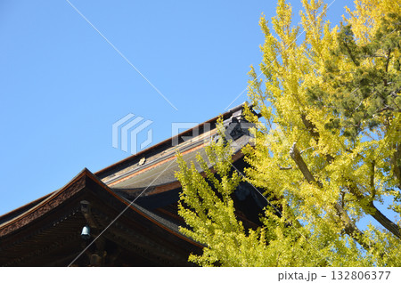 A yellow ginkgo tree 日本の古刹寺院で色づき始めた黄色いイチョウ(銀杏)の大木