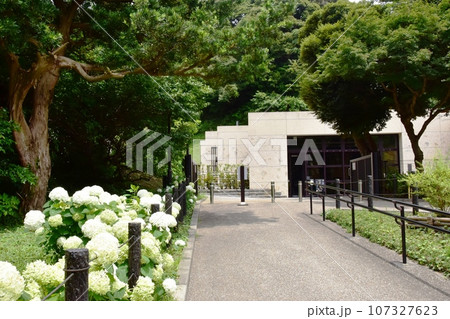 鎌倉市 鎌倉歴史文化交流館本館とエントランスの満開紫陽花アナベル