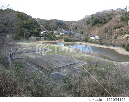 鎌倉市の永福寺跡にある展望台からの眺め(池・阿弥陀堂・二階堂・薬師堂など)
