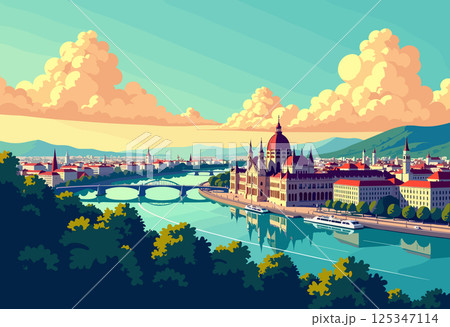 Budapest skyline with Hungarian Parliament and Calvinist church on the Danube
