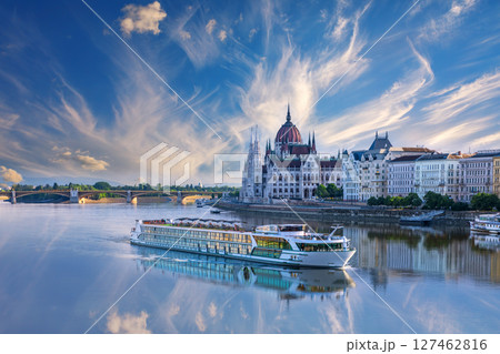 View of cruise ship on the Danube and Budapest Parliament under dramatic sky, Hungary