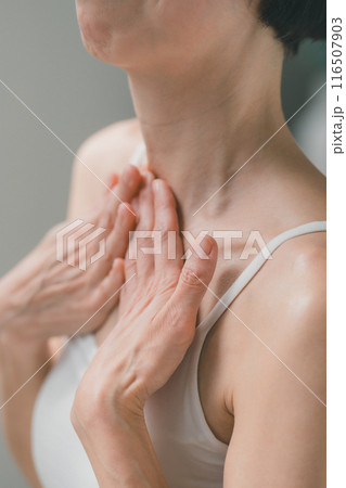 首をマッサージする女性 胸鎖乳突筋メソッド 小顔効果マッサージ ボディパーツ パーツカット